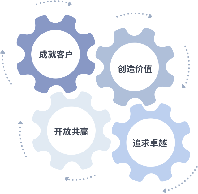 成就客户是一切决策的出发点,创造价值是衡量所有工作的标准,追求卓越是8868体育做事做人的态度,开放共赢是8868体育的格局也是最终的结果。价值观的齿轮环环相扣,推动着组织里的每个人不断向前。